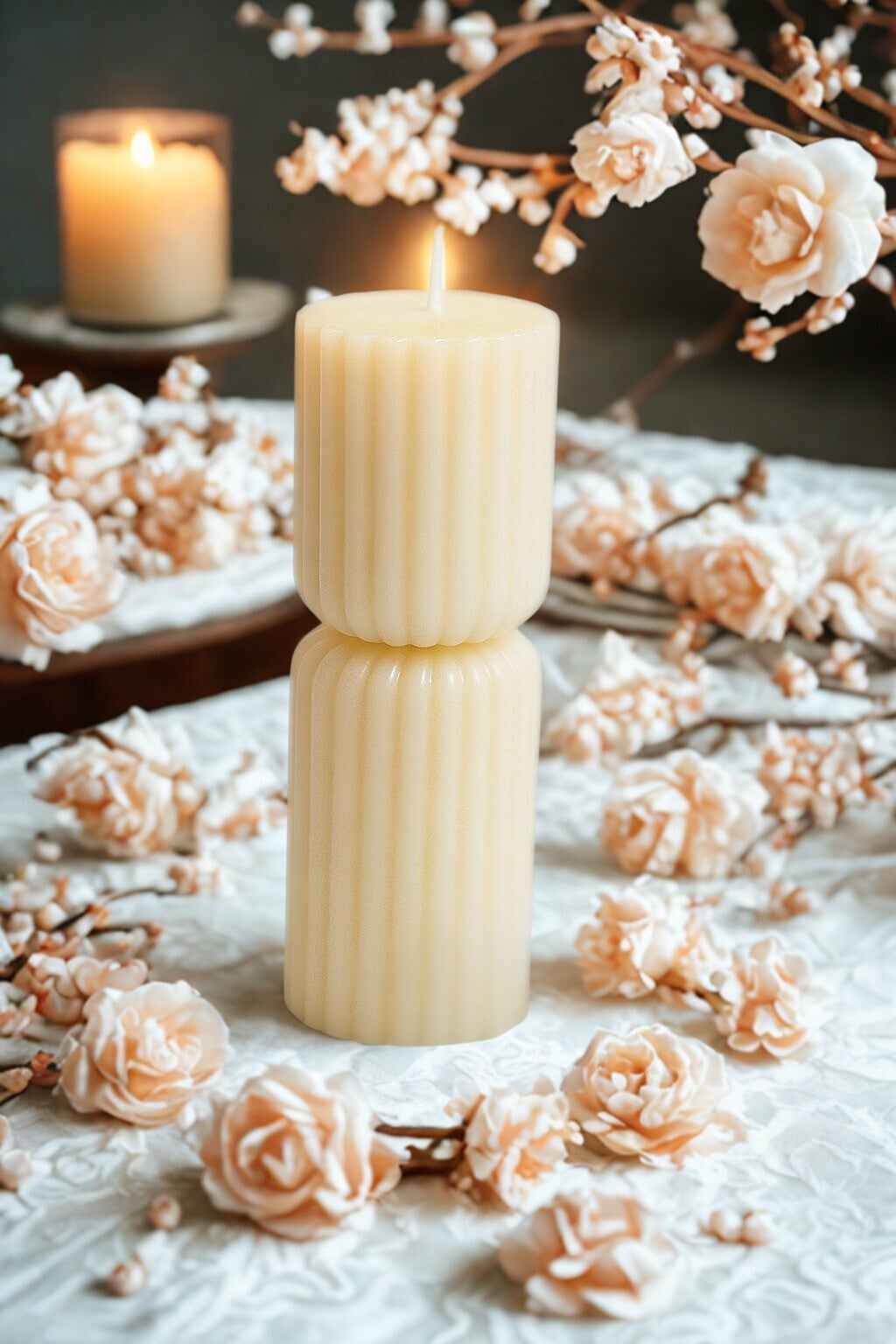 Aceasta este o pereche de lumânări de coloană cu caneluri din fildeș, lumanare cu parfum de caramel